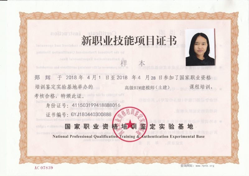 權威身份認可:國家職業資格培訓鑒定實驗基地頒發“BIM建模師”證書,該證書在國家職業資格培訓鑒定實驗基地網上查詢。