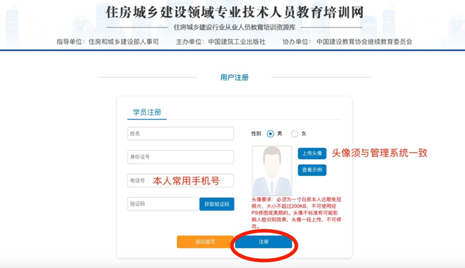 根據(jù)系統(tǒng)提示輸入本人信息,包括姓名、身份證號、常用手機(jī)號、獲取驗(yàn)證碼完成注冊。注冊成功后,系統(tǒng)提示: “注冊成功,用戶名為身份證號,初始密碼為手機(jī)號”,建議更換高強(qiáng)度密碼,以防個人信息泄露。(頭像須與管理系統(tǒng)頭像相同)