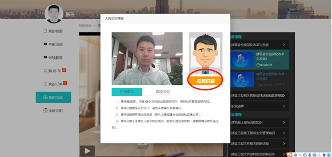 彈出攝像頭人臉識別框后學(xué)員本人將面部對準(zhǔn)攝像頭, 點(diǎn)擊“拍照識別”,系統(tǒng)將進(jìn)行動態(tài)面部識別,識別成功后自動跳轉(zhuǎn)學(xué)習(xí)界面進(jìn)行學(xué)習(xí),請務(wù)必保證本人信息真實(shí),經(jīng)核查系統(tǒng)抓拍照片,如發(fā)現(xiàn)替學(xué)情況,系統(tǒng)將進(jìn)行學(xué)時清零, 需重新學(xué)習(xí)。