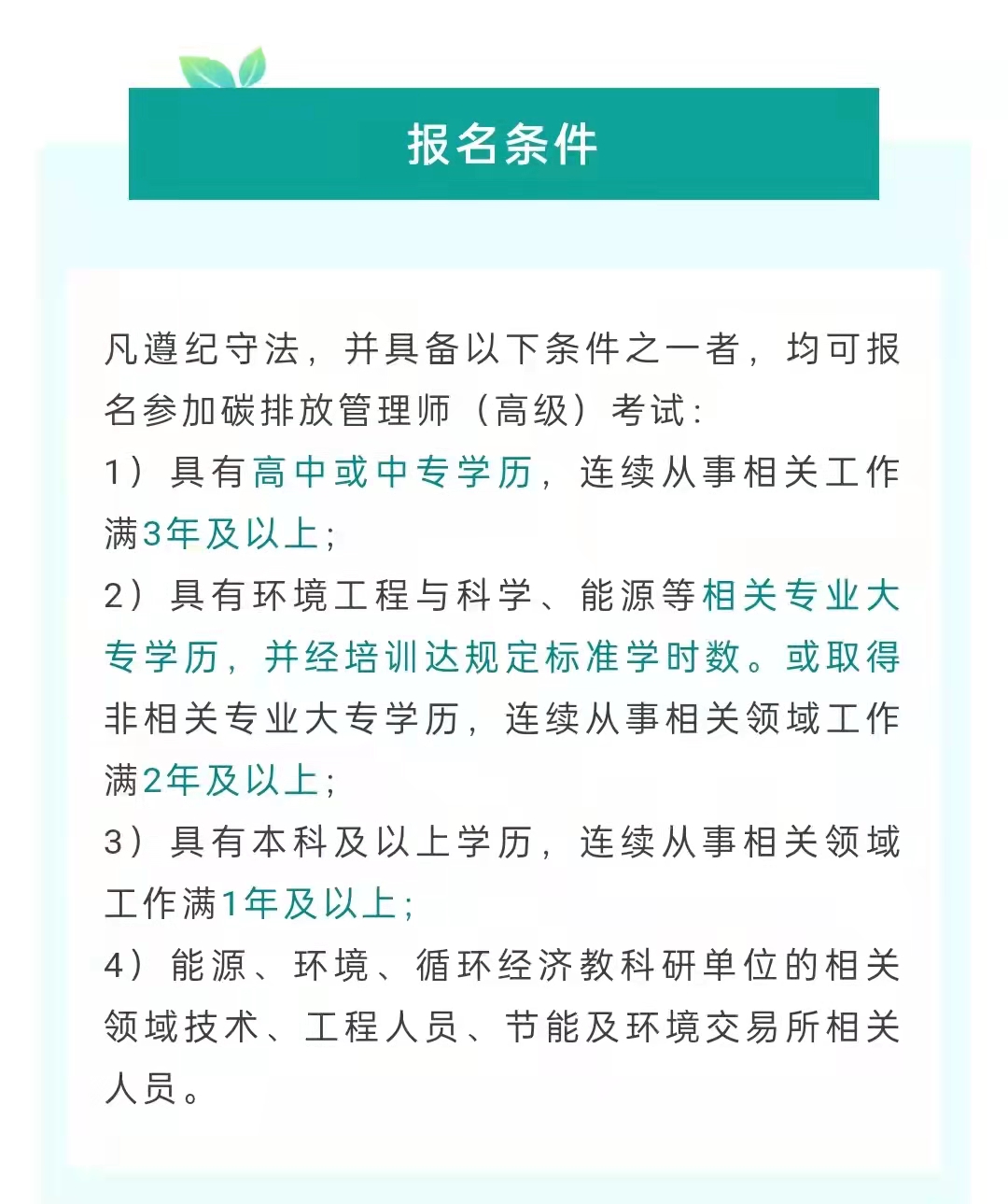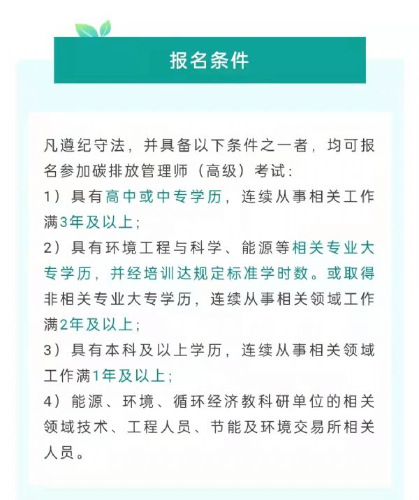 凡遵紀守法,并具備以下條件之一者,均可報名參加碳排放管理師(高級)考試: