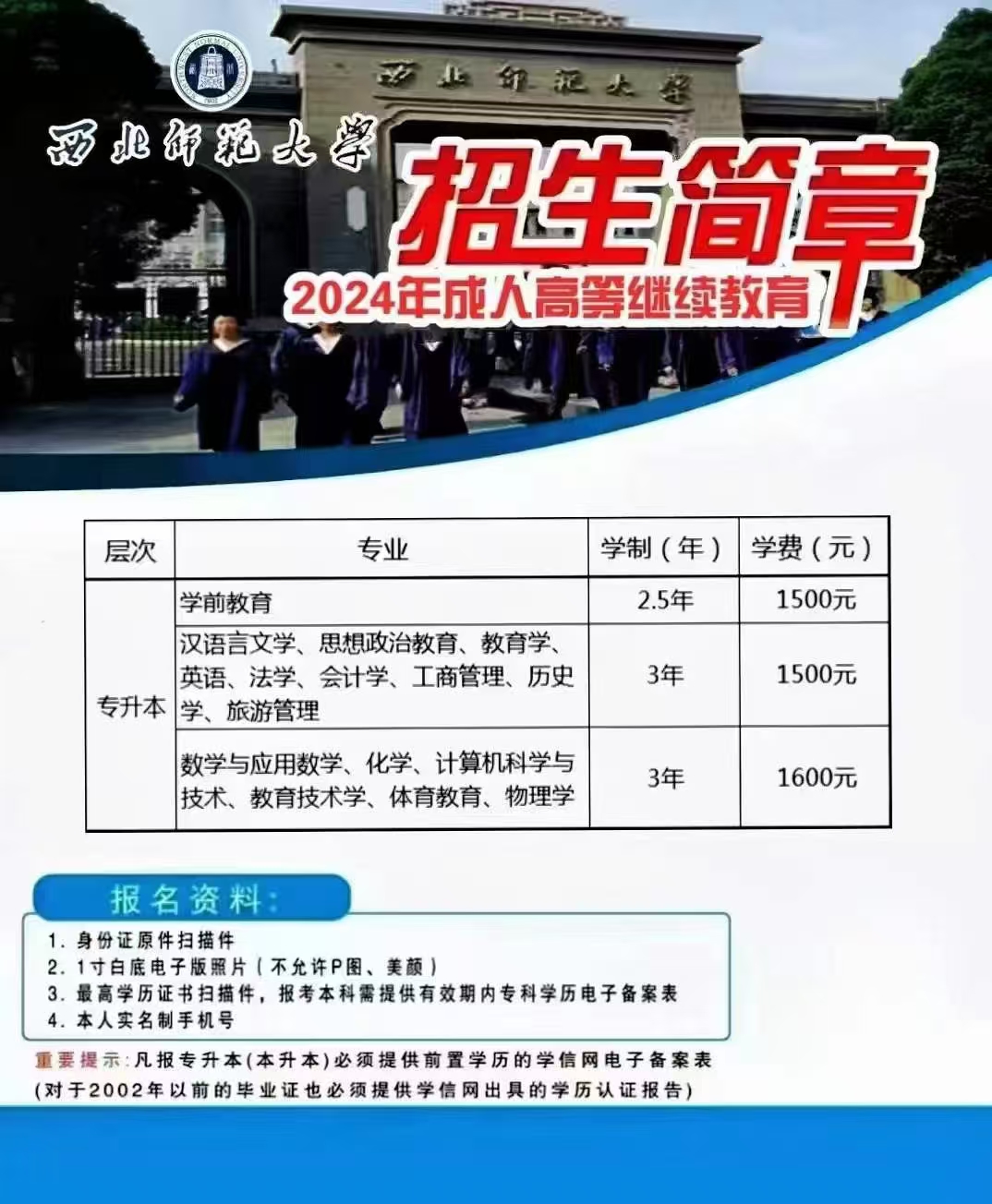 西北師范大學繼續教育學院主要從事全校高等學歷繼續教育、 高等教育自學考試和各類非學歷教育培訓工作。開設專升本、高起 本、高起專,包括學前教育、教育技術學、漢語言文學、計算機科 學與技術、工商管理等25個專業。目前,各類在校學生34000余 人,已形成了較為完善的繼續教育體系。學院主動適應國家戰略和 區域經濟社會發展需要,按照“創新發展、規范管理、提升質量、 服務社會”的指導方針,堅持“立足教育行業、聚焦重點領域、面 向重點人群,扎根西部、服務全國”的辦學定位,以不斷滿足社會 各類人員繼續教育需求為導向,以學習者職業能力提升為重點,培